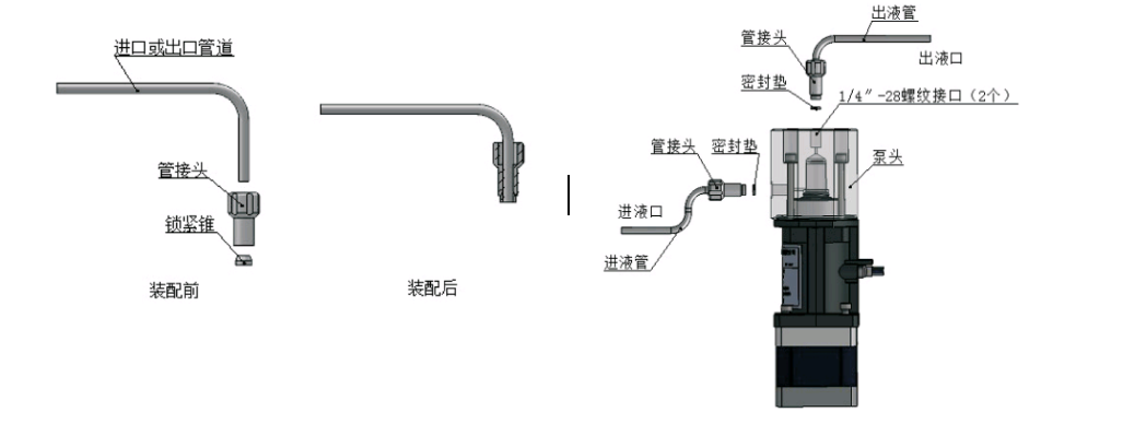 微型柱塞泵通過泵頭的2個1/4''-28內螺紋接口,連接進、出口管路。
